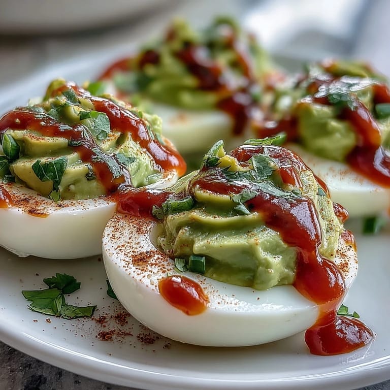 Save Avocado Deviled Eggs with Sriracha Drizzle offer a vibrant twist on a classic favorite. Creamy avocado replaces mayonnaise in these colorful deviled eggs, topped with a spicy Sriracha kick. They are perfect for parties or as a healthy snack for any occasion.