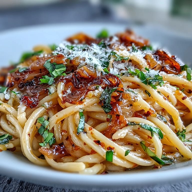 Save The first time I made this pasta, my kitchen smelled so incredible that my neighbor knocked on the door to ask what I was cooking. The combination of slowly caramelized onions and fragrant chili oil creates an aroma that fills the whole house. I had originally planned to experiment with something more complicated, but sometimes the simplest ideas turn out the best.