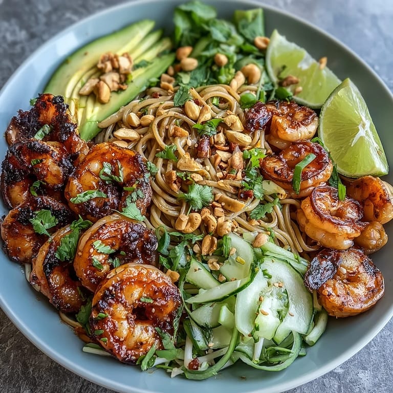 A crisp Riesling or chilled green tea serves this beautifully because both have enough brightness to echo the lime and sesame without competing with the delicate shrimp. If you need to prep ahead, keep the noodles in one container, the toppings separately, and grill the shrimp fresh when you're ready to eat. The dressed noodles will keep for a day or two in the fridge, but everything tastes best assembled and eaten within the hour.