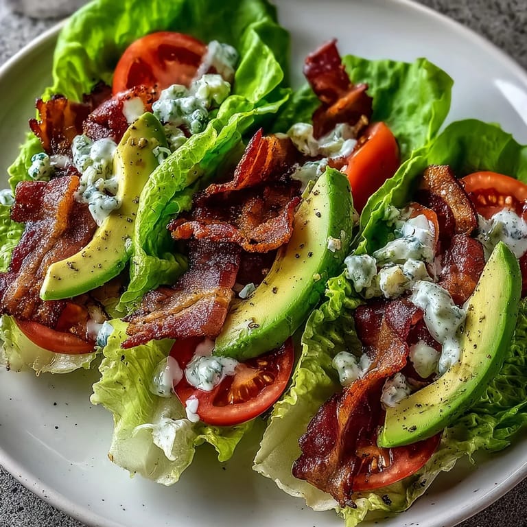 Save Enjoy a fresh, low-carb twist on the classic BLT with these crisp lettuce wraps. Packed with smoky bacon, juicy tomatoes, and creamy avocado slices, this dish is elevated by a punchy, homemade garlic mayo and finished with plenty of freshly cracked black pepper. It is an ideal meal for those following a Keto or Gluten-Free lifestyle who want a satisfying crunch without the bread.