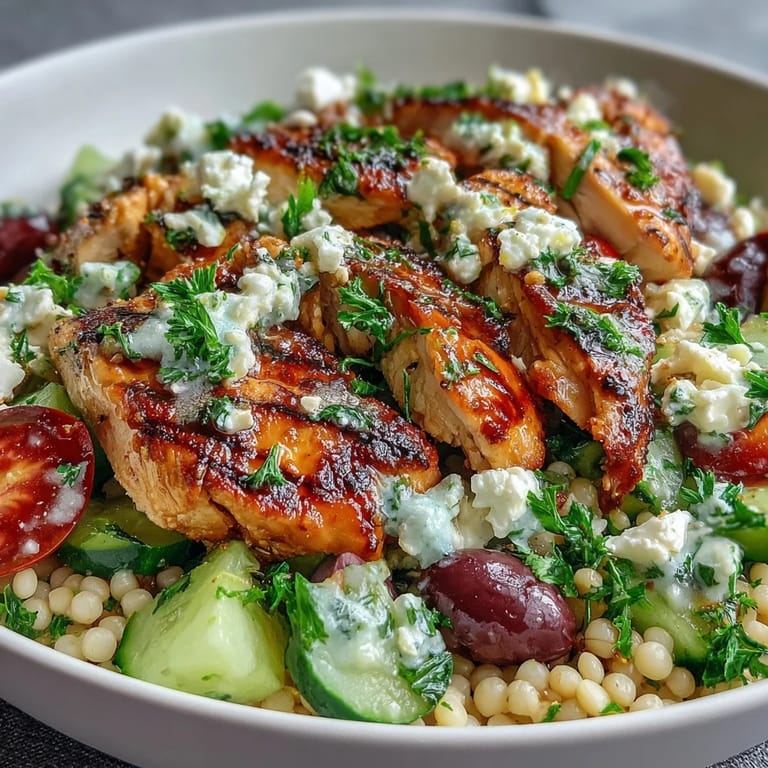 Save There's something about the sound of chicken sizzling in a hot pan that makes me feel like I'm cooking in a sun-drenched Mediterranean kitchen, even when I'm nowhere near the coast. This bowl came together one weeknight when I wanted something that tasted like a vacation but didn't require me to leave my apartment or spend hours at the stove. The combination of tangy feta, bright lemon, and those chewy pearl couscous grains felt like I'd finally cracked the code on making weeknight dinners feel intentional and special.