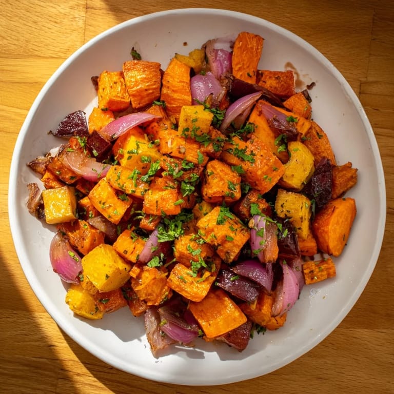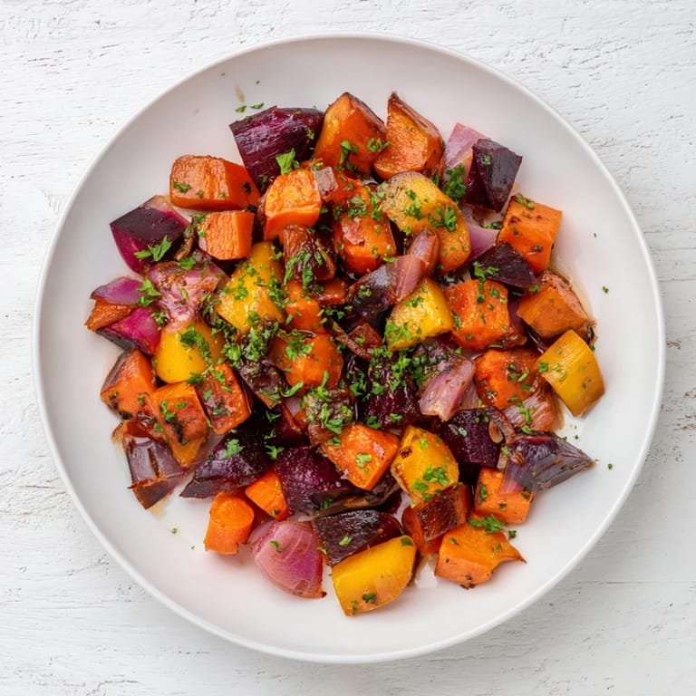 Save Experience the comforting warmth of a Roasted Root Vegetable Medley, where a colorful selection of carrots, parsnips, sweet potatoes, red onion, and golden beets come together in a savory roast. Finished with a tangy-sweet balsamic glaze, this dish is as visually stunning as it is delicious—perfect for a hearty side or a satisfying vegetarian main course.
