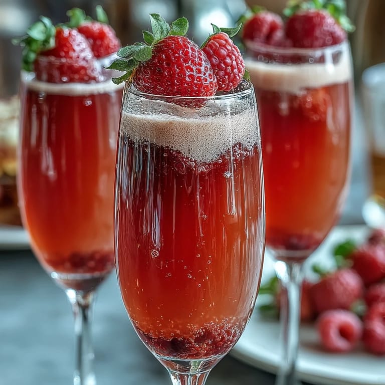 - Pulse the strawberries (and raspberries if using) with just a splash of juice until you get a smooth, pourable puree—you want it thick enough to sink to the bottom of a glass but liquid enough to pour. Strain it through a fine-mesh sieve if you want it silky, but honestly, a little texture is nice.