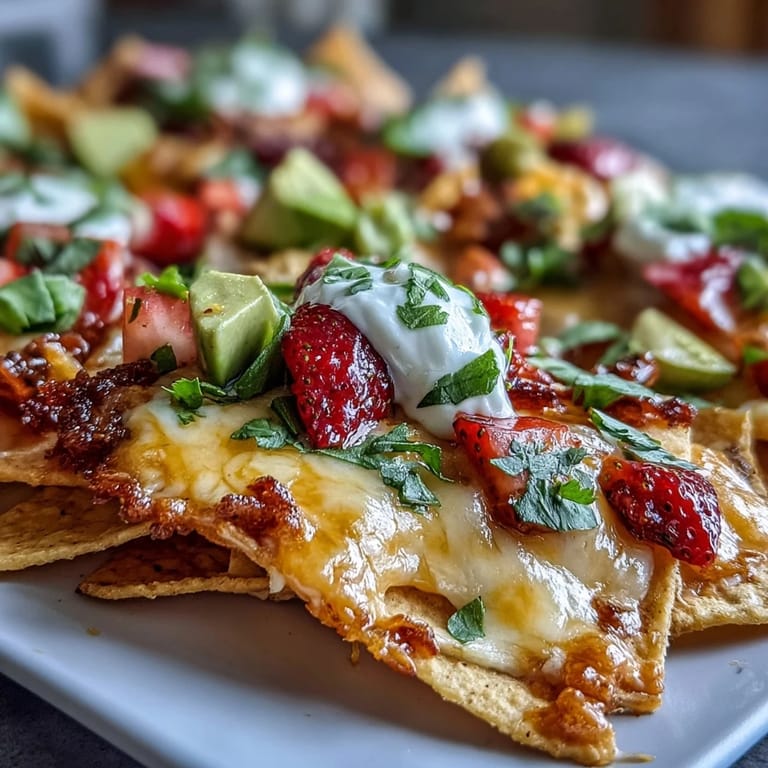 Save The magic of this dish lies in the contrast of flavors and textures. While the foundation of warm, cheesy tortilla chips provides familiar comfort, the strawberry salsa—kissed with lime, jalapeño, and fresh cilantro—introduces a bright, summery note that keeps everyone coming back for more. Each bite offers something different: creamy avocado, tangy sour cream, the pop of cherry tomatoes, and the gentle heat of pickled jalapeños, all harmonizing with the surprising sweetness of fresh strawberries.
